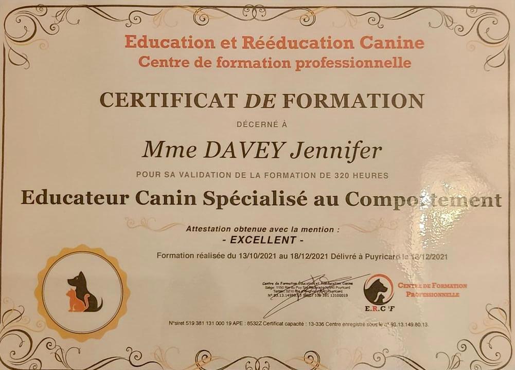 Formée au Centre ERC (Éducation et Rééducation Canine) à Aix-en-Provence – Puyricard, j’ai obtenu ma certification avec mention « excellent ». Ce centre, reconnu pour ses valeurs de respect et de bienveillance, m’a permis de développer une approche douce et respectueuse pour accompagner les chiens et leurs propriétaires.